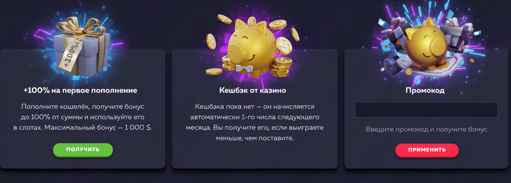 Велком-бонус гости получают сразу после регистрации. Он активируется в соответствующем разделе, а заработанные выигрыши приходят на дополнительный счет. В число приветственного пакета входят: